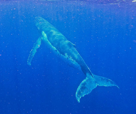 Das Buckelwalmännchen schwebt etwa zehn oder fünfzehn Meter unter uns und singt inbrünstig, so dass wir die Vibrationen körperlich spüren. Im trüben Wasser sind vorerst nur die weissen Umrisse der Schwanzflosse und des Hinterleibs zu erkennen. Wir warten und lauschen dem Konzert. Schliesslich wird immer mehr des riesigen Körpers sichtbar. Langsam steigt der Wal an die Oberfläche bis er unweit von uns auftaucht, frische Luft holt, um dann wieder gemächlich abzutauchen. Wir filmen wie verrückt und sind ganz aus dem Häuschen, als wir zurück an Bord klettern und die anderen vier Teilnehmer an die Reihe kommen.