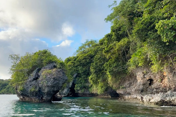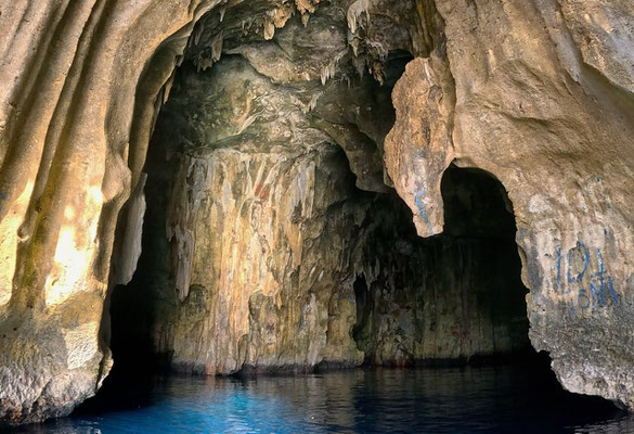 Wir ziehen weiter zur Insel Kapa und begeben uns auf Erkundungstour. Mit dem Dinghy fahren wir den Felswänden entlang und in einige der Höhlen hinein. Die Swallows Cave scheint oft besucht zu werden, denn ihre Wände sind von vielen Graffitis verunstaltet. An der mit Stalaktiten geschmückten Decke ruhen sich an die hundert Fledermäuse aus, die aufgeschreckt umherflattern, als wir uns ihrem Zuhause nähern. Obwohl es in der Höhle dunkel ist, leuchtet das Wasser intensiv blau und man erspäht den Grund. Andere sind nicht so verunstaltet und beherbergen auch nicht so viele Fledermäuse, weil die Decke bereits teilweise eingebrochen ist. Durch die Bäume schimmert grünes Licht in die Höhlen und verleiht ihnen etwas Mystisches.