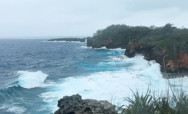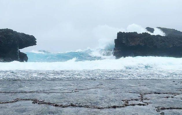 Tosende Wellen auf der Luvseite von Kenutu Island (Bild 1-3) | Wellen preschen zwischen zwei Inseln hindurch | auf der Leeseite kommt kaum etwas von den Wellen an
