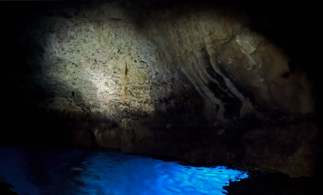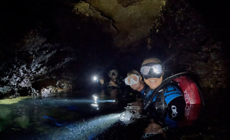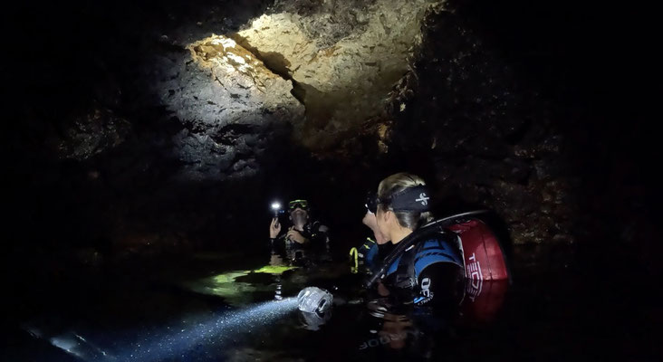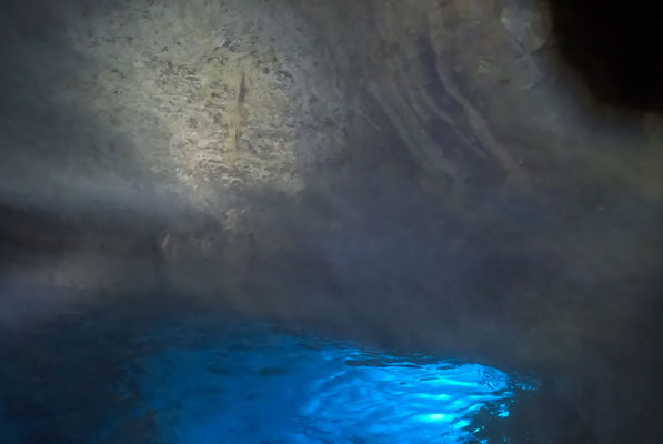 Hier beobachten wir ein spannendes Phänomen: Wellen, die aussen gegen die Felsen klatschen, heben den Wasserspiegel in den Höhlen kurzfristig an, was sich mit Ohrendruck bemerkbar macht. Sinkt das Wasser und damit der Druck wieder, kondensiert die feuchte Luft für einen Moment und Nebel umgibt uns.