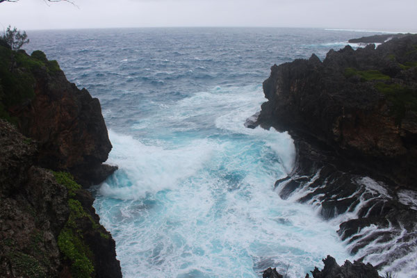 Zusammen mit Tash und Tim von der der MOODY RUDIE suchen wir uns einen Weg durch den Wald, um auf die Luvseite der Insel zu gelangen. Dort blickt man von steilen Felswänden hinab in eine tosende See. Die Wellen brechen weiss schäumend und mit bedrohlicher Kraft gegen messerscharfe Klippen. Der Wind pustet uns den Niesel direkt ins Gesicht und dramatisiert das Schauspiel zusätzlich. Ehrfürchtig starren wir hinab und versuchen dabei nicht zu nahe an den Abgrund zu treten. Die Insel ist lediglich dreihundert Meter breit, was für ein Unterschied zwischen der Luv und der Leeseite!