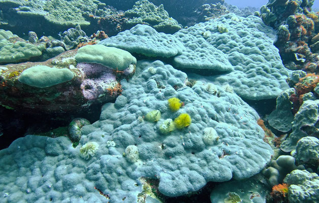 Ein Tauchgang führt uns zu einem üppig mit Korallen und Weihnachtsbaumwürmern überwachsensen Riff, das als Chinese Garden bekannt ist. Ein anderes Mal tauchen wir in die Sharktooth Höhle. Im Strahl der Taschenlampe sieht man, dass die Höhlenwände mit roten und gelben Korallen überwachsen sind. Lobster und junge Weissspitzen-Riffhaie verstecken sich in dunklen Nischen. Der Hauptteil der Höhle, wie auch die beiden Zugänge befinden sich unter Wasser, aber am Ende zweier Höhlengänge kann man an die Oberfläche auftauchen.